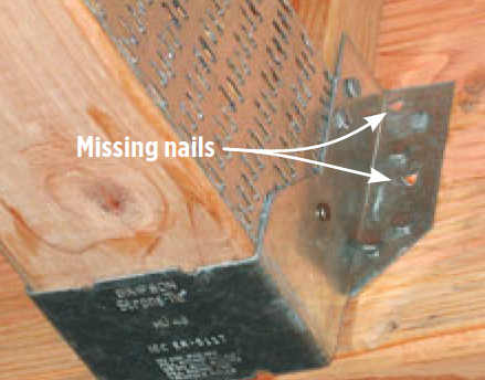 The most common fastening problem I see is that hardware is missing nails. If nail holes are left unfilled, the connector won’t fully resist the loads it was designed to handle and may deflect, resulting in damage to floor and ceiling finishes. Worse yet, the connector may fail. Unless otherwise noted on the plans, it’s best to fill all the holes in the framing connector. The truss hanger shown here would support an additional 500 pounds if the four triangular holes (two in each side) had been filled. I sometimes see hardware installed with the wrong size and type of nails, often because someone decided to save money by using standard collated nails. This reduces the load the hardware can carry; smaller-diameter fasteners are less resistant to shear, and shorter ones are less resistant to withdrawal.