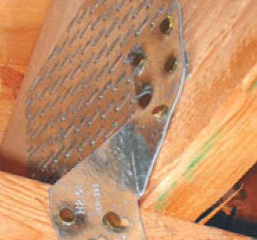 When a nail misses the factory-punched hole and makes its own hole — as happened to this hurricane connector (left) — it reduces the shear capacity. If you install a lot of framing hardware, invest in a gun designed to accurately place nails in the factory-punched holes.