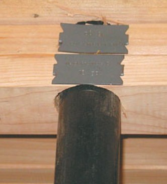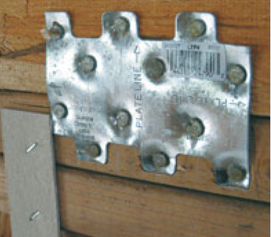 Well-intentioned trade contractors usually try to repair top plates at mechanical and plumbing penetrations, but they don’t always do it correctly. Under IRC section R602.6.1, when more than 50 percent of the width of a top plate is drilled or notched out, the plate must be reinforced on both sides with a 16-gauge metal strap attached with eight 16-penny nails on both sides of the hole or notch. IRC section P2603.2.1 specifies that any pipes that aren’t cast iron or steel within 1 1/2 inches of the edge of the framing must be protected by a 16-gauge steel plate that extends 2 inches past the top and bottom plates. The small nail stoppers on this wall (left) meet neither requirement and should be replaced with a protecting shield plate like the one shown (right).