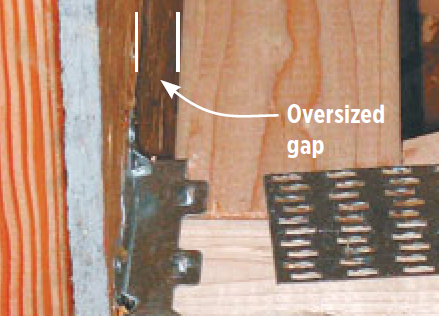 Most hangers are designed so that the gap between the end of the joist (or truss) and the back of the hanger is no greater than 1/8 inch. An oversized gap — like the one at the back of this truss (left) — places the downward force further from the supporting header, increasing the rotational force on the hanger and reducing its load rating. Luckily, there are ways to deal with oversized gaps. For starters, a number of joist and truss hangers have been tested with gaps of up to 3/8 inch and the reduced loads published. When oversize gaps occur, the designer should compare the design load to the published load and determine whether there is a problem. It may also be possible to shim or build out the header, though such field repairs should be approved by the building or truss designer. A third option is to use a hanger that has a deep seat and added nailing capacity, and can handle gaps up to 1/2 inch (right).