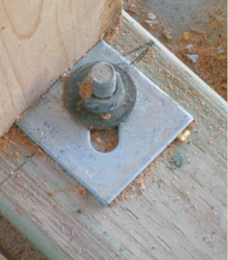 Typically a standard cut washer and hex nut are all that’s needed to attach mudsills to embedded anchor bolts. In seismic regions, though, code requires 3-inch-square bearing plates .229 inch thick. Installed in place of the washer, these plates are intended to keep sills from splitting during earthquakes. When anchor bolts are not carefully located, the bearing plates can extend beyond the edge of the sill or conflict with framing. To address this problem, some carpenters simply notch the rim, joist, or stud around the plate and anchor bolt (top), but this is a crude fix that weakens the framing and can lead to a failed inspection. A better solution — and one allowed by code — is to use a slotted plate that can be shifted out of the way (bottom left).