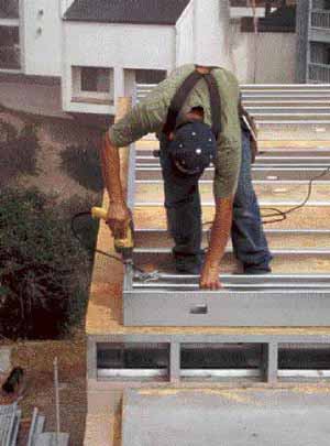 Steel Framing TerminologyTo build with LGS, the first thing you need to learn is how to order material. The Steel Stud Manufacturers Association (SSMA) recently standardized the way it describes studs and track. The convention is to specify the web, member type, flange, and thickness. For example, a set of plans might call for a 1200S162-68. The first set of numbers describes the depth of the web. In this case, it’s 1200, which is 12.00 inches. The letter “S” stands for stud (“T” for track, “F” for furring channel). The next set of numbers refers to the width of the flange. In this case, it’s 162, which is 1.62 inches (15/8 inches). The last number refers to the thickness in mils (thousandths of an inch) of the steel used to make the stud. Here, it’s 68 mils (.068 inch) thick, 14-gauge steel. By convention, track is sized by inside dimension (ID), and studs are sized by outside dimension (OD). This means that studs will fit perfectly if you order them the same size as the track. Wood framers build walls with 2×4 and 2×6 studs. The equivalent material for steel framers would be 362S162-33 (3 5/8 x 1 5/8-inch 20-gauge) and 550S162-33 (5 1/2 x 1 5/8-inch 20-gauge). You can tell by looking that they’re wall studs, but different-gauge metals are sometimes specified for different parts of the frame. To avoid confusion, each stud and track gets labeled every foot by the roll-forming machine. Additionally, some manufacturers color-code the ends of material. The most common colors by gauge are: 20-gauge (33 mils), red; 18-gauge (43 mils), yellow; 16-gauge (54 mils), green; 14-gauge (68 mils), orange; 12-gauge (97 mils), blue or black. There are also designations for the strength of the steel, the thickness of the galvanized coating, and whether the studs have holes punched in them. Strength is rated in “ksi.” For 20- and 18-gauge material, the minimum rating is 33ksi. For 16-gauge and thicker, it’s 55ksi. G-60 is the minimum galvanized coating allowed for load- bearing studs. You can order G-90 and thicker coatings for buildings in harsh, exposed environments. |