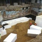 ICC project manager Tyler Finkle notes that the job involved moving four structures: the main house, a two-story garage, a guest house, and a house on an abutting parcel that had to be moved to make space for the first three. Because the basement of the main house was finished—amenities included a movie theater and a bowling alley—the decision was made to move foundation and house together. Doing so involved excavating much of the 14-acre site and trundling the structure along a prepared 275-foot move route on the flat bottom of the hole.