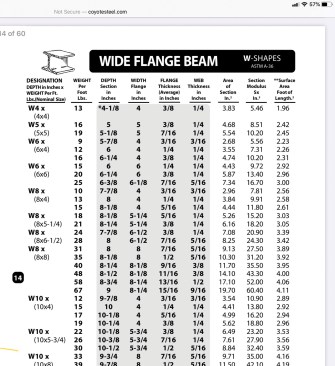 Whenever a set of plans includes steel framing, the author refers to a printed list of steel sizes with actual dimensions; shown here is a page from Coyote Steel & Company's "Handbook of Steel Sizes and Weights for Industry," which the author finds to be a particularly useful resource.