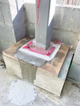 Rather than attach the steel columns directly to the footings and bury them between block work, or attach them to footing pads below the concrete slab, we decided to elevate the steel attachment points. We did this by reinforcing the CMU walls with additional rebar and grout wherever there was an attachment point and by forming a reinforced concrete “pedestal” above slab height on the interior of the foundation for each interior column. This way, if any of the steel columns needed adjustment later for plumb, they wouldn’t be buried under the concrete.