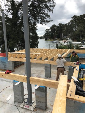Once the steel columns were in place, the framing crew began installing the sawn-lumber floor system (left). In some places, the framing had to be notched to fit around the steel (above).