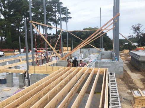 Where practical, workers set up staging to work on elevated areas as they assembled the framing.
