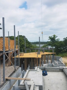 For example, the two-story great room would have three layers of windows with steel between each window unit and a “U” shaped steel beam welded to the top of the columns to support a large roof overhang. Starting from the top of the CMU wall, our benchmark elevation, we laid out all the wood framing elements it would take to determine the top of the rafter bearing height at the roof. Then we shot grades with a transit across the top of our foundation wall and measured down to the top of each concrete pedestal location. This was the best way to ensure that each column would be level with the others. We took this measurement and added it to the story pole.