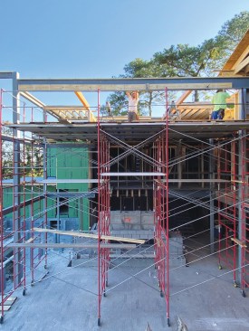 The framing crew erected an extensive temporary scaffolding system over a future outdoor living pavilion to install the complex steel framing for the master suite.