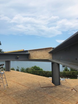 The framing crew worked on the large house one section at a time, so that the steel columns for one area were delivered and installed while the steel supplier fabricated the columns for the next area.