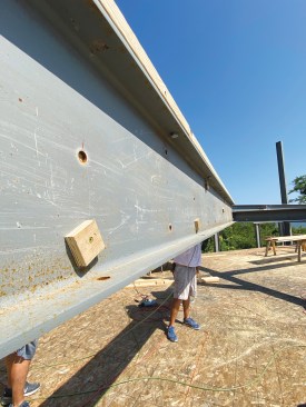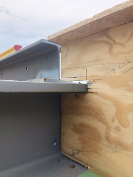 Holding the 2-by packing firmly in place with the plywood screw blocks allows holes for bolts and other penetrations to be safely and accurately drilled out (left). The top plates are held in place by 1/2-inch diameter lag screws driven up through holes in the flange, and so had to be installed before completing the beam pack-out.