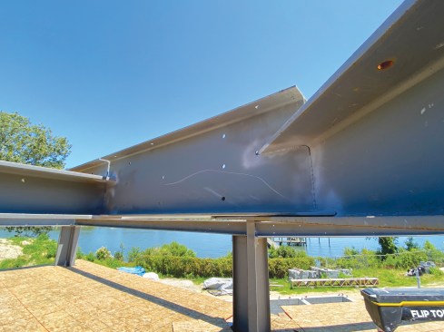 Where the beams needed plates, we drove 1 1/2-inch-long by 1/2-inch-diameter lag screws through holes that the steel fabricator had made in the flanges into the bottom of 2-by stock sized to match the width of the flange. On vertical posts, we fastened wood members to the steel using Reamer Tek self-tapping wood-to-steel screws.