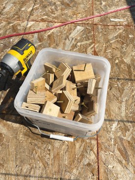 Steel beams have to be packed out to adapt them to conventional wood framing. The crew started by cutting 3-inch-square plywood blocks and driving screws part way through the center of the blocks.