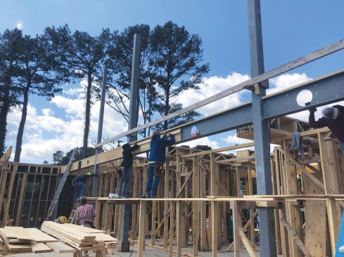 Because of the size of the project, we worked in sections, erecting the steel and framing in one location while ordering the materials for the next. Once the steel framing was packed out, framing and sheathing the structure was straightforward.