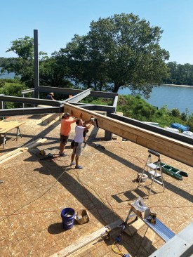 Packing out. Almost all the beams needed to be packed out with sawn lumber to connect to the wood-framed joist systems. The process of packing out a steel beam is—not surprisingly—time consuming. On this job, the structural plans called for using 5/8-inch-diameter carriage bolts 16 inches on-center at staggered locations to fasten the sawn lumber to the steel. While the steel fabricator had drilled the necessary 11/16-inch-diameter holes in the beams, it’s still challenging to hold a 2×10 or 2×12 in place against the web of a beam while someone else safely drills the holes out for the bolts from the other side.