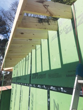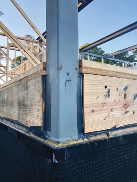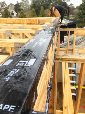 To protect the packed out beams from water during the construction process, workers wrapped the tops of the beams with Zip tape.