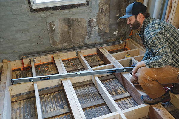 Co-author Chris Hovious checks the framing for flatness after leveling an existing floor for a bathroom remodel. New framing and sistered 2-by stock was added to support the existing joists and help stiffen the floor.