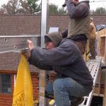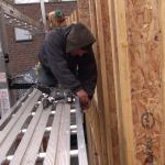 Meanwhile, the rest of the Maine Passive House carpentry crew (Todd, Steve, and Caleb) worked to install the last of the overhang framing on the addition’s steep south-facing gable. The crew set up pump jacks, applied permeable weather-tight Pro Clima Mento Plus membrane lapping from the I-joist wall build-out up onto the I-joist roof rafters, and then attached an overhang outrigger to the wall over the membrane.