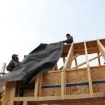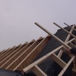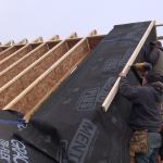 The building science details for this roof system involve a method that is increasingly common for cathedral roofs in Passive House construction. The underside of the rafters will receive a smart vapor barrier fabric (Pro Clima Intello) designed to resist the passage of moisture into the insulated cavities from interior space, but still allow the cavities to dry to the inside if necessary. The upper side of the rafters will receive a water-tight, air-tight, vapor-open fabric (Pro Clima Mento Plus) intended to allow drying to the outside. Over the rafters and fabric, the crew will first apply cross-strapping to form a vented air space, then OSB sheathing, then asphalt felt and fiberglass-asphalt shingles. The design is intended to minimize the risk of vapor intrusion while maximizing the system’s ability to dry out. We’ll keep you updated as work continues.
