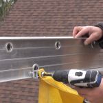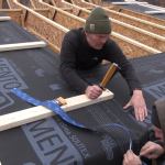 Contractor Jesper Kruse figures the fascia width on a rafter tail, taking into account the thickness of roof strapping not yet applied.