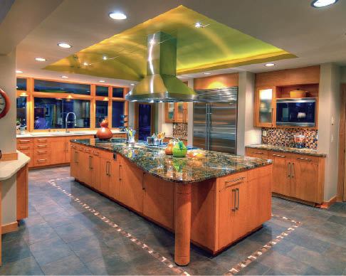 In response, our in-house architect came up with a plan that involved building an addition off the back of the house and relocating the laundry room to another area. The existing kitchen was around 200 square feet; we would be adding another 360 square feet and wanted to do something to make the area special. In many kitchens, the island is the centerpiece of the room, so we decided to create a complementary focal point on the ceiling above. Since we had been in the attic and knew there was space to expand vertically, we suggested building an uplit barrel vault centered over the island. The owners liked the idea because it took what would have been a large, low ceiling and turned it into a conversation piece.