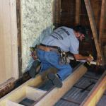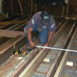 I began the installation in the highest corner. Pulling the layout from the opposite wall, I locked the first new joist in position with a scrap screwed to the nearest old joist. With the high point set, I measured the height from the joist to the laser, then shimmed up the other end of the joist until the measurement matched. At the midpoint of the joist, I measured the gap between the joist and the top plate of the supporting wall below and cut a block to fit. The first joist set the height for the rest of the floor, so it was just a matter of working my way across the floor, bringing each joist up to that level.
