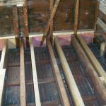 Keeping your balance as you walk on the edges of joists can be tricky and dangerous, so I tacked down a few of the old boards for safe footing. Because storage space in the house was at a premium, I built temporary supports out of scrap 2x4s and loaded all the LVL joist stock into the room.