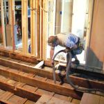 It became obvious that I would need a place out of the way to position my laser at a consistent height while I installed the joists. I ended up building a small platform that I suspended from the ceiling near the middle of the room. Then I set up my laser level and confirmed my high point to start the framing. With the joists cut to fit just inside the exterior sheathing, it would be tough to slide them by the stools on the two windows, which faced each other from the center of opposing walls. My solution was to cut notches in the framing for the joists to slip through. That allowed me to distribute the rest of the joists along the floor.