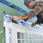 For window and door installations, we use the same basic flashing techniques with Zip sheathing that we use for walls wrapped with housewrap. The one big difference is that we’re ultimately relying on the adhesive bond between the tape and the sheathing to keep water out of the wall. First, we cover the rough sill with 6-inch Zip tape or less-expensive 9-inch Vycor or Moistop, lapping the flashing out and over the sheathing. At the bottom corners of the opening, we use either a flexible flashing tape or Vycorner prefabricated self-adhering corners (866/333-3726, graceconstruction.com). Then we caulk the back of the unit’s nailing fins with a flexible adhesive and set the window into the opening. Next, we flash the fins to the sheathing, making sure to firmly J-roll the flashing tape to the wall and nail fins. Finally, we install the head flashing over the trim at the top of the window, taping the Z-metal to the wall with Zip tape.