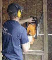 I use a Stihl MS 290 for this job; I put a 16-inch bar on it, so it’s a little lighter — but it still pumps out 12,500 rpm. Eye protection and ear muffs are a must, of course. And you have to watch out for nails; they’ll dull the teeth in a hurry.