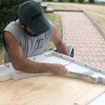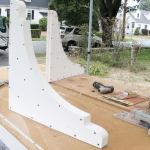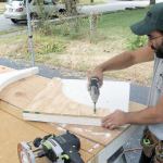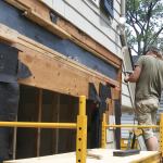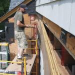 After protecting the sheathing with Vycor flashing tape, we installed the new brackets (13). They fit perfectly; having the screws already in their holes made for an easy installation. Finally we cut plugs from the PVC scraps, glued them in place, and sanded them smooth. The brackets look like they’ve been there for years, which was our goal.