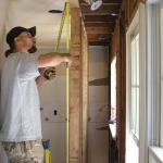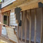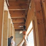We started by removing cabinets and appliances, then cut back a 2-foot width of ceiling drywall so that we could build a temporary studwall to support the second-floor framing over the kitchen. Next, we took out the windows, leaving as much of the framing intact as we could, then removed the rim joist and exposed the ends of the second-floor joists.