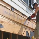 Because the fully assembled beam would measure 4 1„8 inches thick (1 3„4-inch microlam + 5„8-inch steel plate + 1 3„4-inch microlam), we had to cut back the ends of the floor joists 2 5„8 inches to accommodate the additional thickness. Rather than cut all the joists at once, we cut back just four at a time, starting at one end of the wall. With most of the floor system still supported by the wall framing, this gave us a little extra peace of mind as we angled the microlam into place and used our sledgehammer to pound it tight against the joist ends.