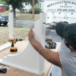 Next we cut two pieces of 5/4 PVC stock to match the original bracket’s 90-degree backer (10). We predrilled holes for attaching to the house, then glued (11) and screwed (12) the brackets to the corner pieces.