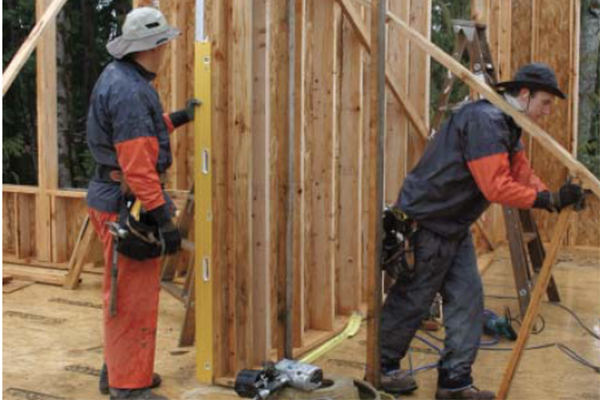 In most cases, when we stand the walls the outside corners are either dead-on or within 1/8 inch of being plumb. Now, I may take some heat for saying this, but I think it’s acceptable for the corners of an 8-foot-tall exterior wall to be as much as 1/4 inch out of plumb. I allow this tolerance because racking a wall once it’s been sheathed is difficult. If the wall is less than 10 feet long, we might be able to rack it by pushing on the upper corner with a forklift, but that will get us only about 1/8 inch.