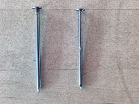 An 8d common nail (left) has a 0.131-inch shank diameter. An 8d box nail (right) has a 0.113-inch shank diameter.