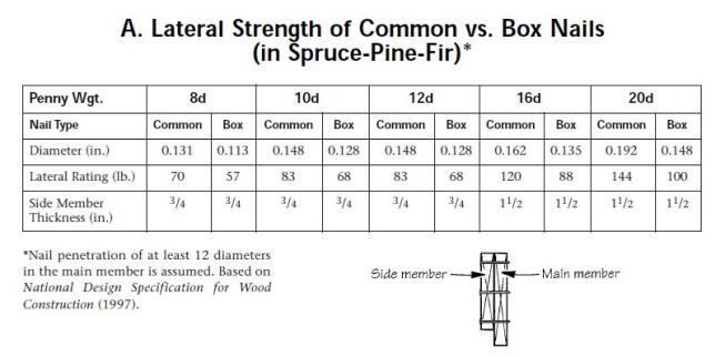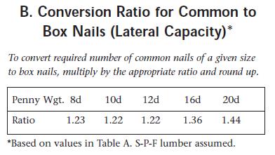 For this reason, you can’t just make a one-to-one substitution of common nails specified in a plan with the same number of box nails. Engineers and architects routinely specify common nails, and their designs are based on rated capacities of commons. But since box nails are popular with many carpenters and are widely available in builder supply stores, I’ve offered a formula (based on Spruce-Pine-Fir lumber) for making a safe conversion from common to box nails (Table B).