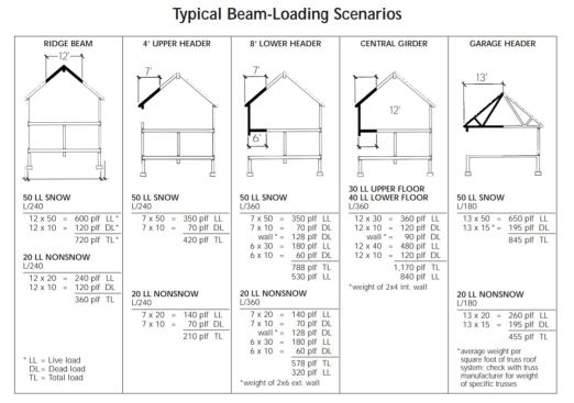 First, I worked out the uniform loads for each of the beams, following the procedure outlined in last month’s article. If you don’t follow the calculations, review that column. I’ve included calculations for two loading conditions. One design assumes a 50-pound snow load and the other is in a 20-pound non-snow climate (both loads are treated as live loads). The applications, as noted in the illustration and the chart below, are: