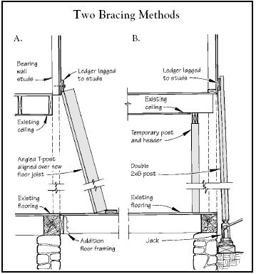 A.Clayton DeKorne responds: Here’s one method that has worked well for me in the past. After stripping the siding off the wall in question, lag a ledger into the wall stud above the existing second-floor level. Then install temporary T-posts made from 2x6s nailed together at right angles, as shown in illustration A, below. We’ve typically installed posts every two feet or so along the ledger, depending on the loads. Only one of the 2x6s in each post bears on the ledger; the other stiffens the bearing 2×6. Use plenty of nails to hold these 2×6 posts together, so the two pieces function as one stiff member.