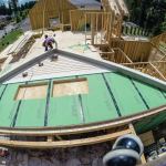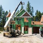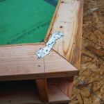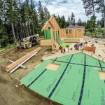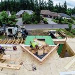 We install fly rafters and any trim, cutting in place and scribing the miters for a perfect fit. At the peak, where the fly rafters meet at a plumb cut, we add an RBC or an A35 clip to keep the overhang from opening as we lift. This keeps the plumb cuts on the trim nice and tight during lifting, too.