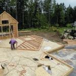 - We cut the bottom plate, lay it out for studs at 16 inches on-center, and tack it on edge to the floor deck.