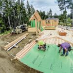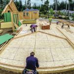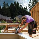 Once the frame is complete, we sheathe and tape the wall (or install housewrap, if we aren’t using Zip Wall), so we are ready to apply an overhang. We frame out a closed gable soffit using 2x6s with cripples every 4 feet on-center. We do all the cutting in place, sizing the overhangs to fit LP SmartSide Soffit, which comes in 12-, 16- and 24-inch–wide panels. To accommodate expansion, we frame the overhang 1/4 inch wider than the soffit material.