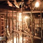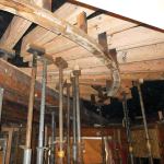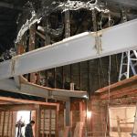 The project called for some creative thinking. The 38-foot-tall by 15-foot-wide bottle had a 2×4 stick frame with an overlay of lath and stucco; two-thirds of the frame’s weight was supported by a steel I-beam that ran diagonally across the outer walls. The engineering report dictated that we find a way to stabilize the 33,000-pound bottle while we replaced the single existing beam with a more robust welded assembly. After much discussion we decided to do this with temporary beams and an array of pole jacks. Once the new steel was in place, the rest of the job was relatively straightforward.