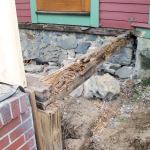Changing the beam spacing meant cutting two additional pockets into the mortared stone foundation wall. Like many old foundation walls, this one was neatly made where exposed to view, but where it was hidden by the porch it was very rough, consisting of small pieces of stone thrown together almost at random. We used a cold chisel to cut the additional 3-inch-deep pockets and deepen the original ones, which extended only an inch or so into the wall. We then reparged the face of the wall around the pockets with cement mortar.