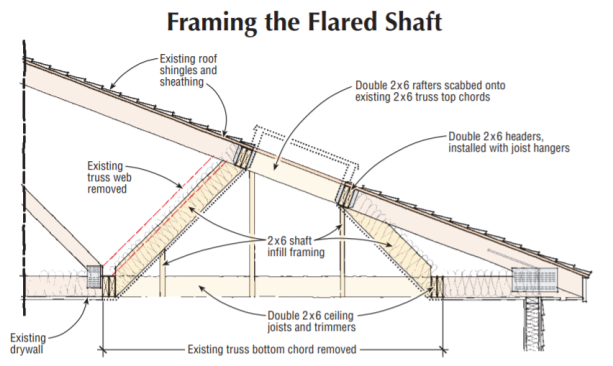 Of course, trusses, if unaltered, make it impossible to angle the sides of a skylight well. Granted, you could install a narrow skylight that fits between the 2-foot-on-center trusses, and still angle the top and bottom walls of the shaft. But in my opinion, it’s well worth the extra effort it takes to remove and alter the necessary trusses to allow for all four walls of the chase to be angled.