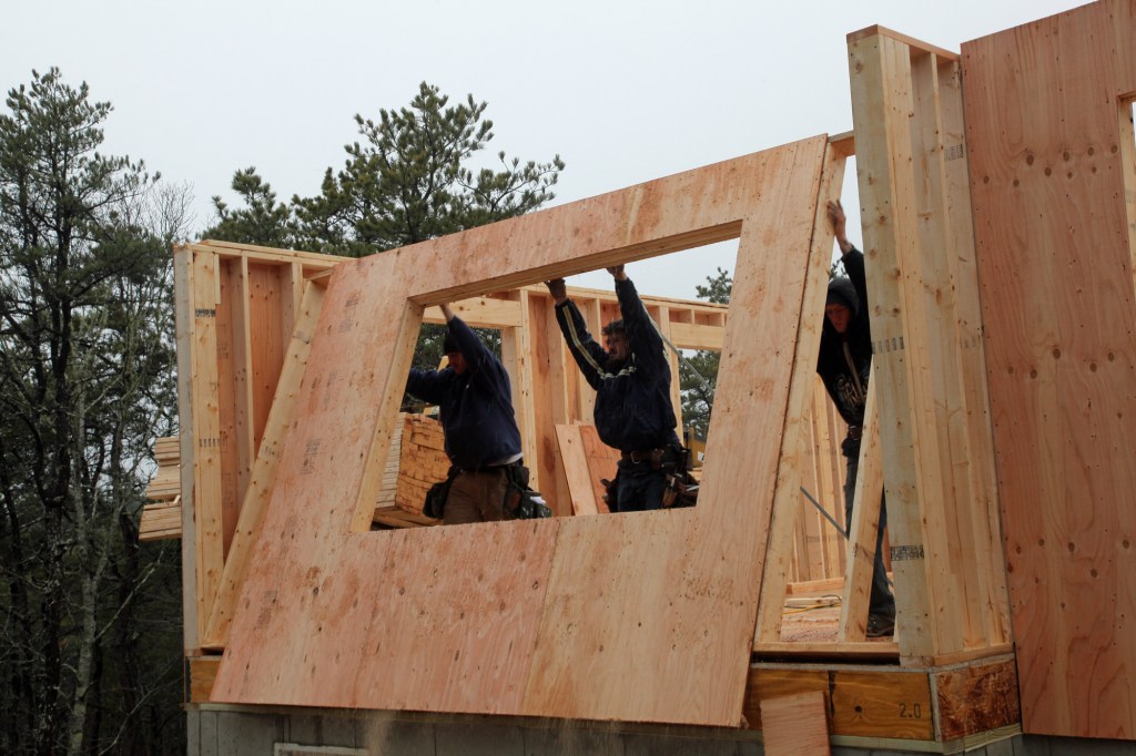 The Cape Cod-based framing crew in these first photos installed the CDX sheathing vertically and in a side-to-side layout specified by an engineer to maximize racking strength and wind resistance in the wall. As is usually the case, this crew attached the sheathing to the frame before standing it up.