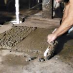 As soon as the holes pass inspection, I cut five 18-inch lengths of 1/2-inch rebar for each hole, then start mixing the concrete. I’ll fill the hole about a third of the way and tamp it with a shovel to remove air bubbles. I then position the first three pieces of rebar, setting them on top of concrete fragments, which helps them stay in place. I lay two more pieces of rebar in the opposite direction, and continue adding concrete until the hole is filled. After the mix sets for few minutes, I screed the surface flat with a straightedge, let the water rise, and broom it off. After another few minutes, I lightly tap the surface with the straightedge, then screed it flush with the slab. In a few minutes I brush off any water that rises and let the concrete cure.