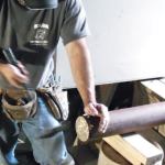 I check both ends of each column before marking the cut line – usually one end is cut straighter and flatter, so I want to make my cut at the other end. I prop the columns in a stable position (generally on horses, but here I used the basement stairs) and go to work with the cutter and pipe wrench. You’ve got to pay attention to keep the cutting wheel tracking in the middle of the line. I start with the cutter snug, then increase the cutting depth about a half turn with each revolution.