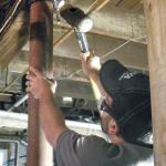 When I'm satisfied the column is plumb, I remove the nearby jacks, putting the weight of the house on top. I run two 3/8-inch-by-2-inch galvanized lag screws into the beam.