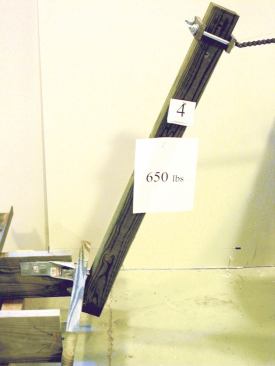 We tested the connection two ways — with the post located inside the band and on the outside. We observed different types of failure for the two cases as the load increased up to the maximum of about 650 pounds.